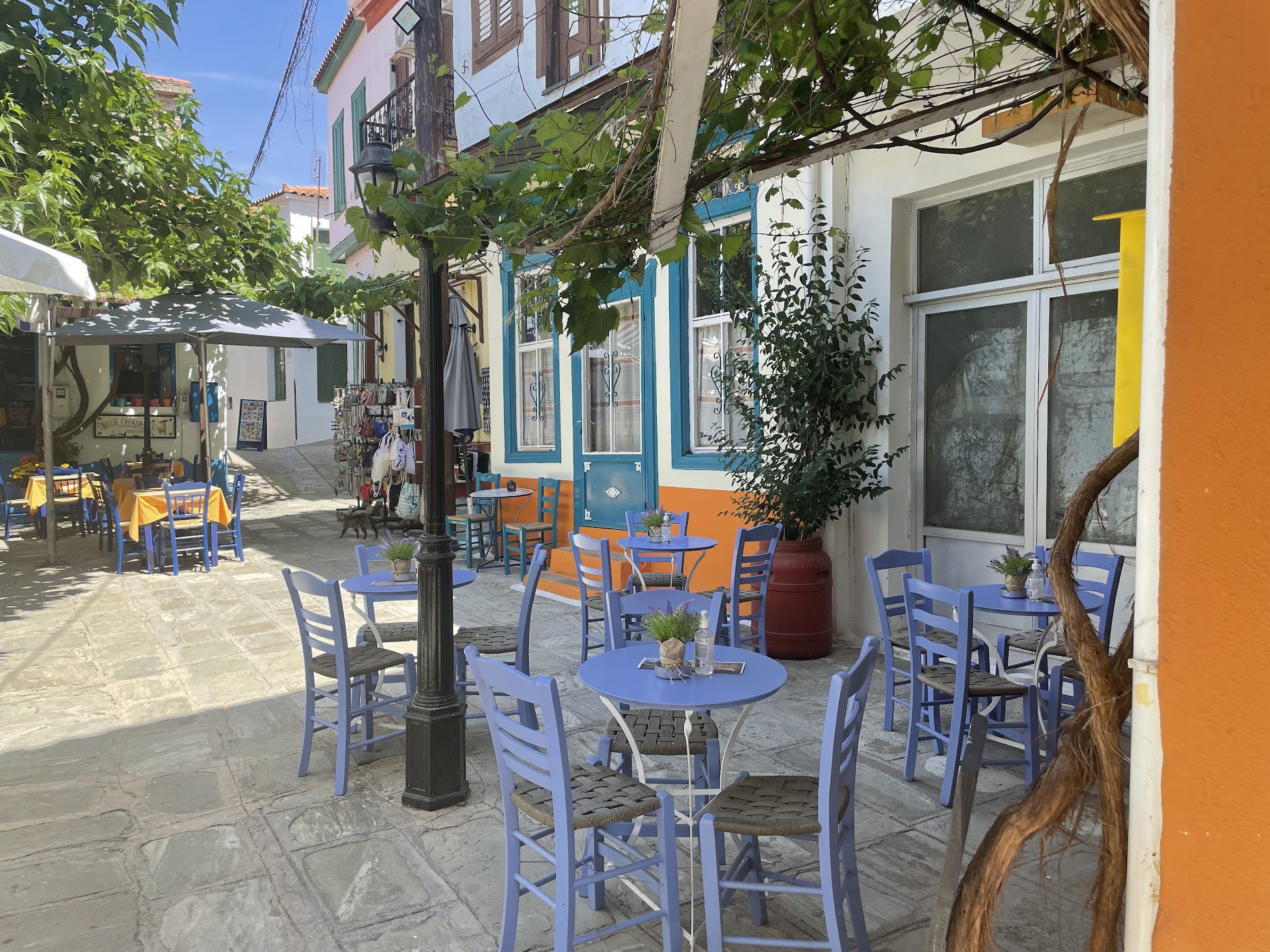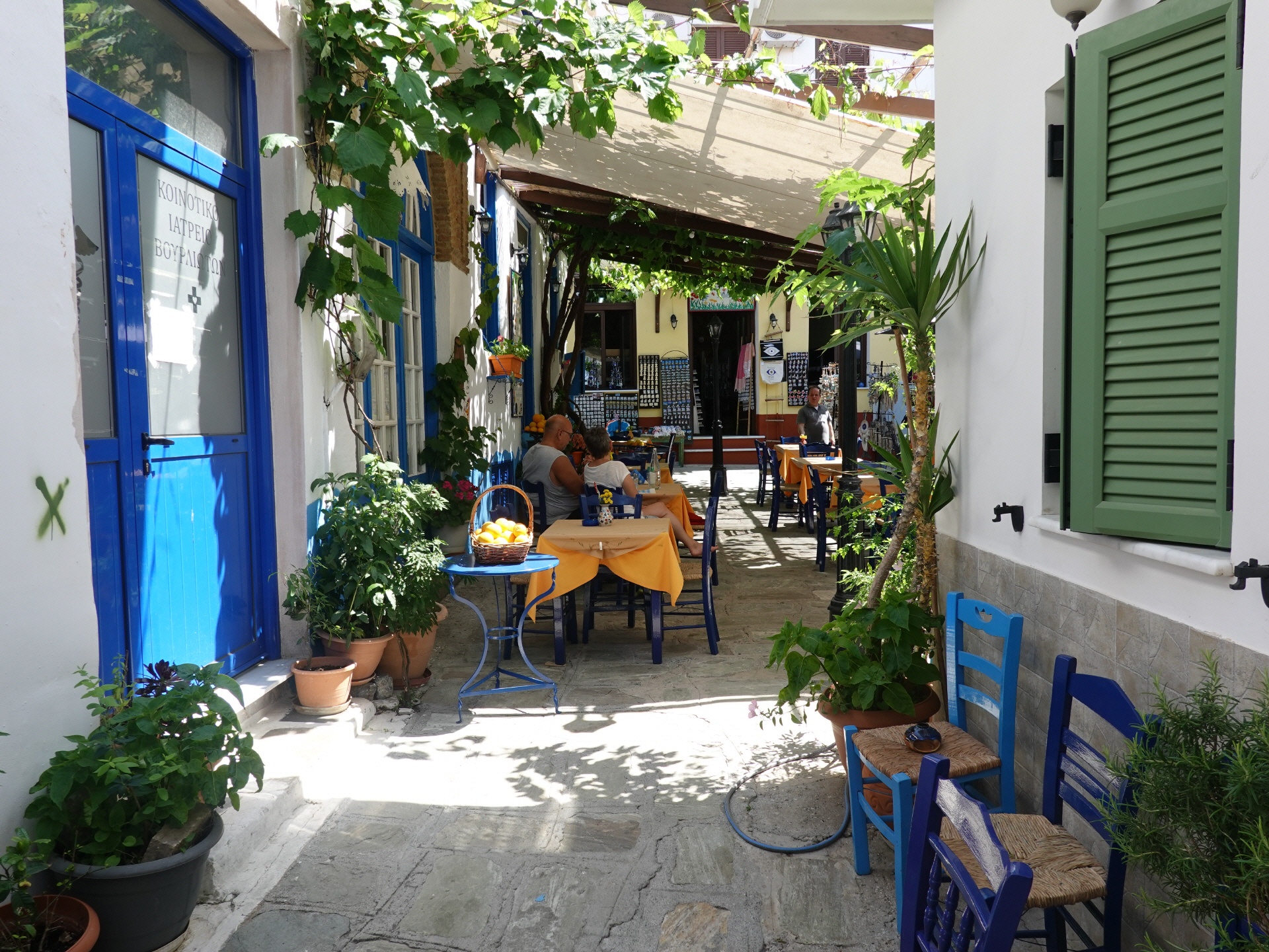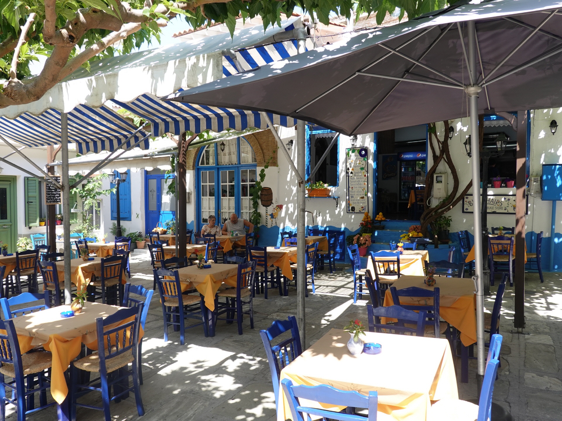 Unser Tipp für eine Stärkung: Taverne Blue Chairs liegt direkt an der Platia, ist erkennbar an den blauen Sesseln. Preiswerte sehr gut Küche. |