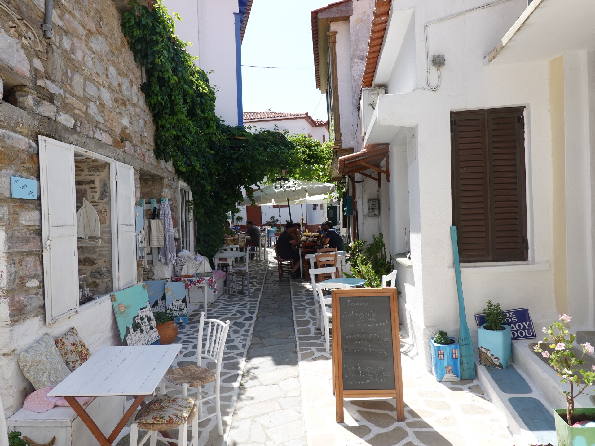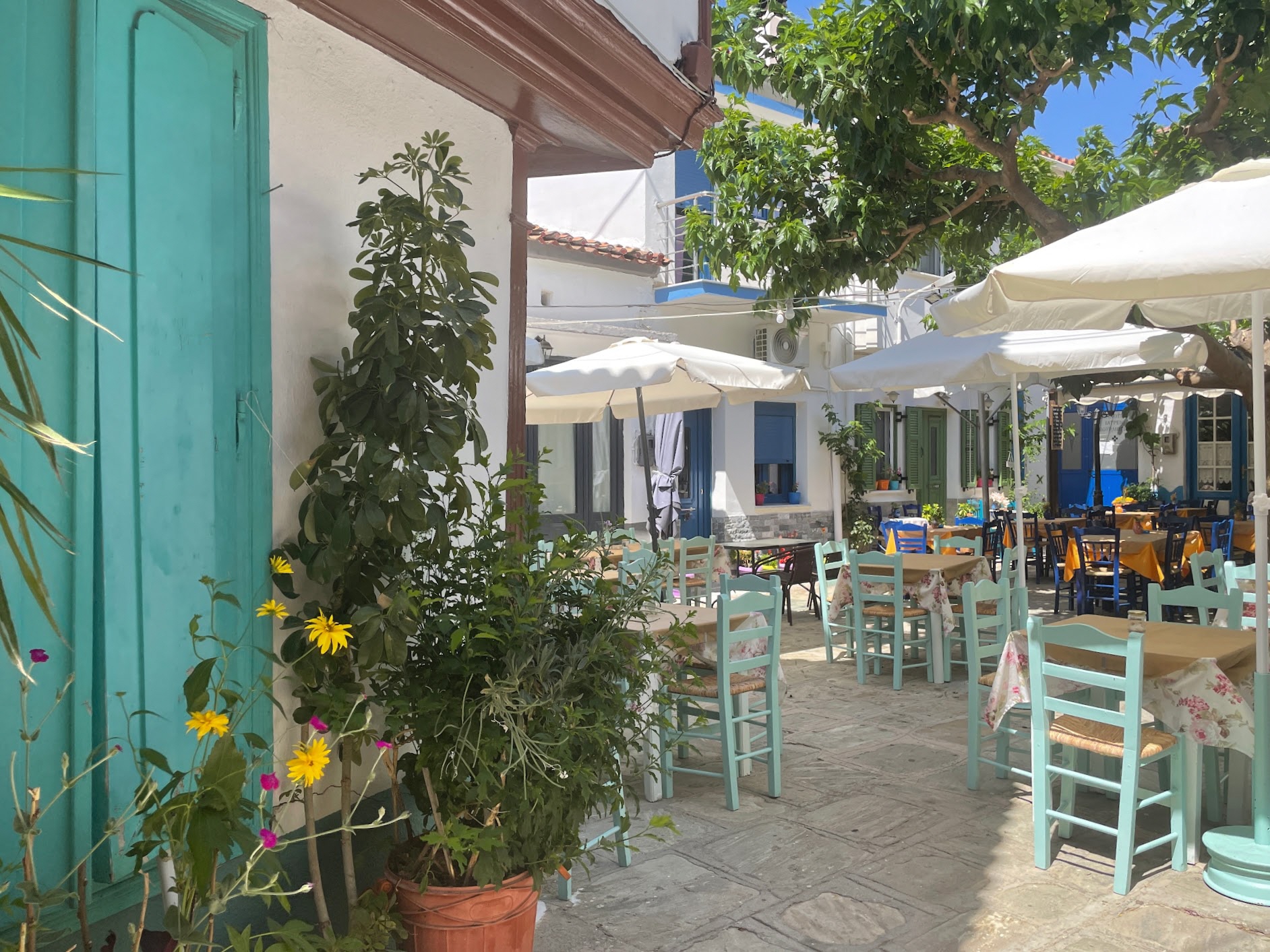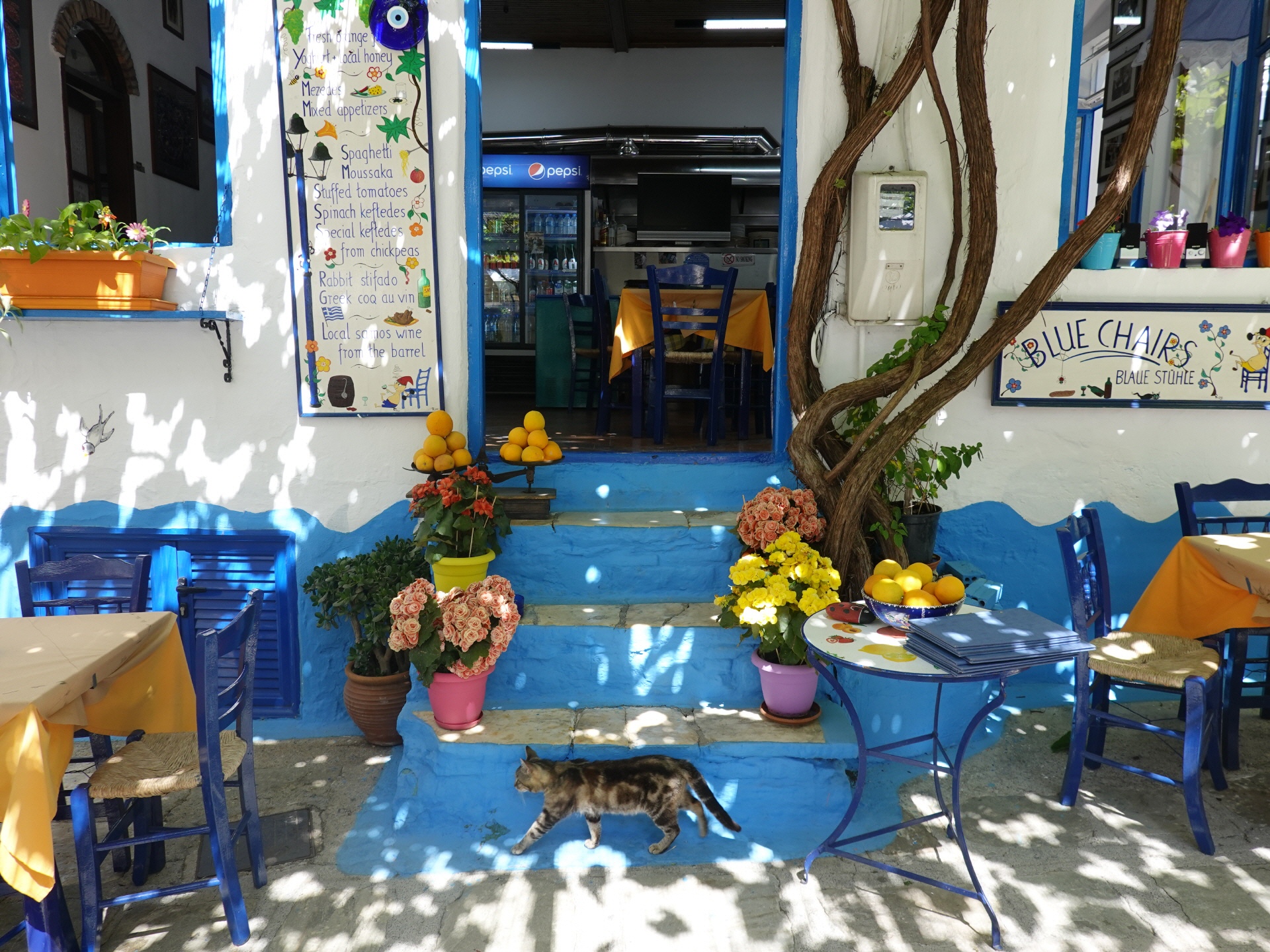 Unser Tipp für eine Stärkung: Taverne Blue Chairs liegt direkt an der Platia, ist erkennbar an den blauen Sesseln. Preiswerte sehr gut Küche. |