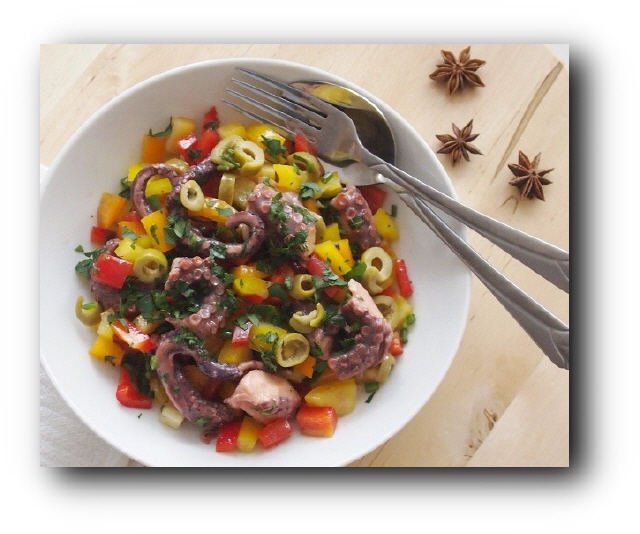 Chtapodi in nussgroße Stücke schneiden und mit der Olivenöl-Zwiebel-Petersilien-Marinade vermischen. Essig und Zitronenzesten nach belieben dazugeben.