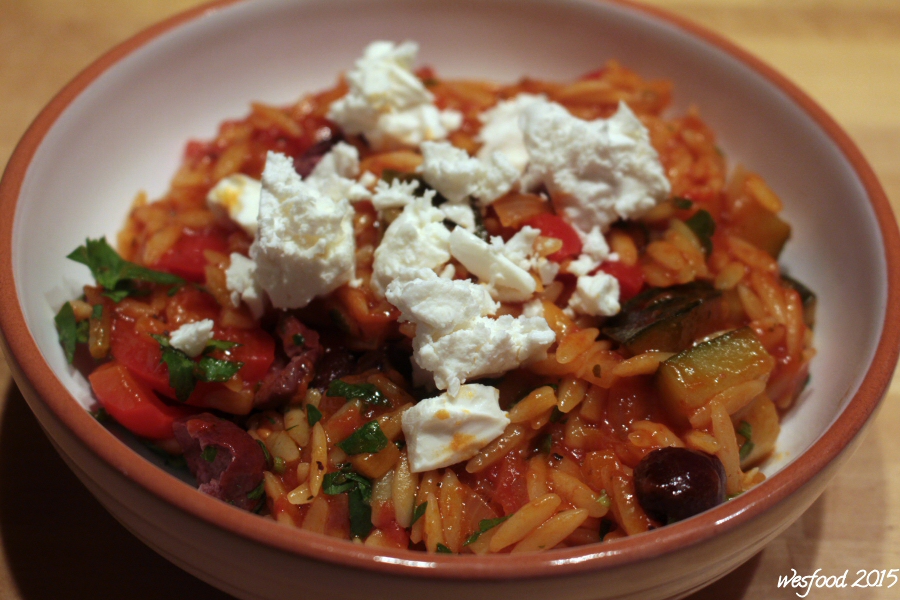 Jouvetsi mit Hühnerfleisch Beilage: griechischer Salat und ein gutes Glas Wein Retzina