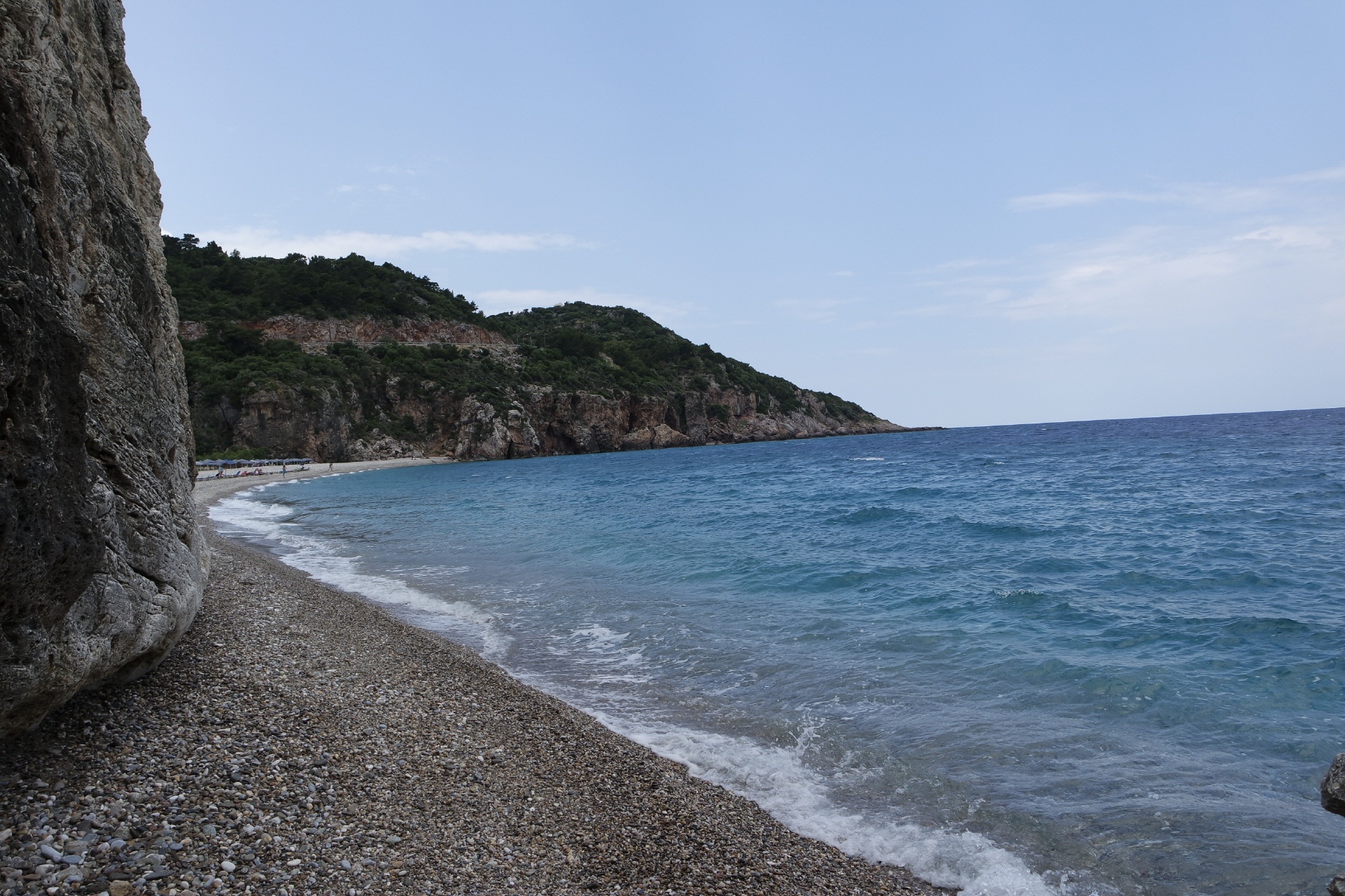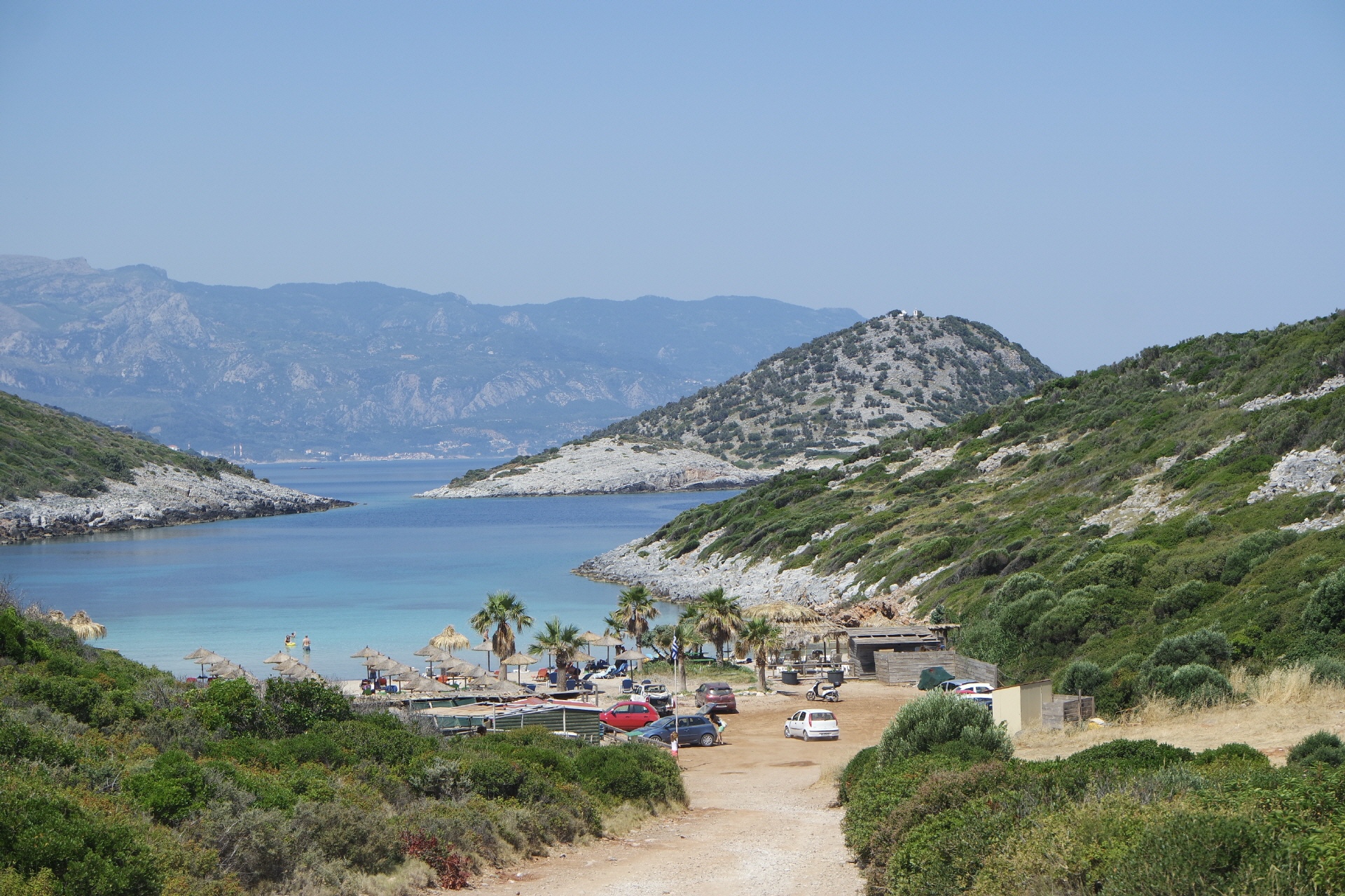 Die Bucht liegt im Norden, tief unterhalb der Inselstraße ca. 1,5 km nach Kokkari.