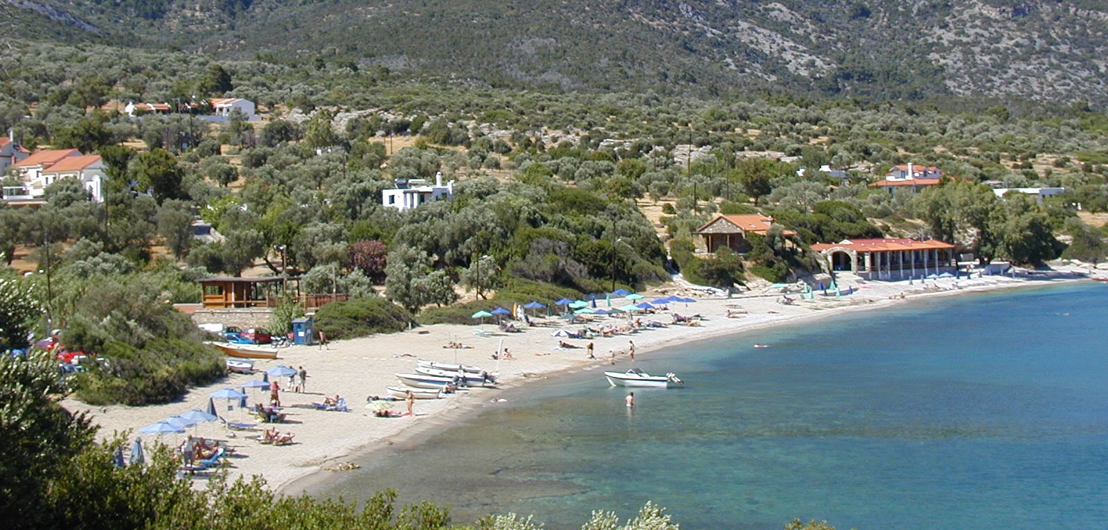 Limnionas - Der Kiesstrand liegt im Südwesten der Insel. Sehr beliebt bei Schnorchler, doch achtung , - es gibt viele Felsplatten.