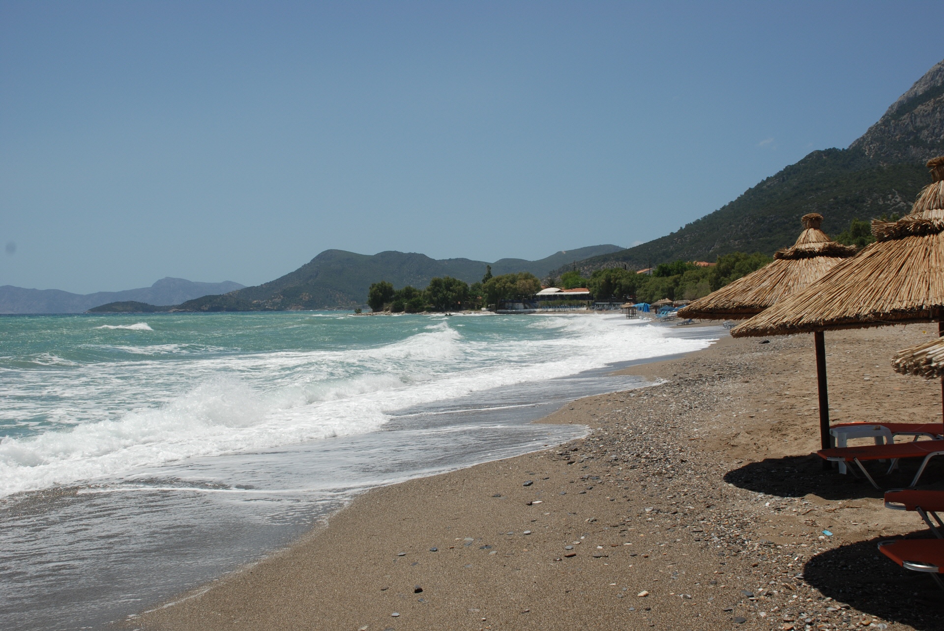 3 km nach Votsalakia liegt dieser sehr flach abfallende Strand, jedoch nicht so ein feiner Sand wie im Osten.